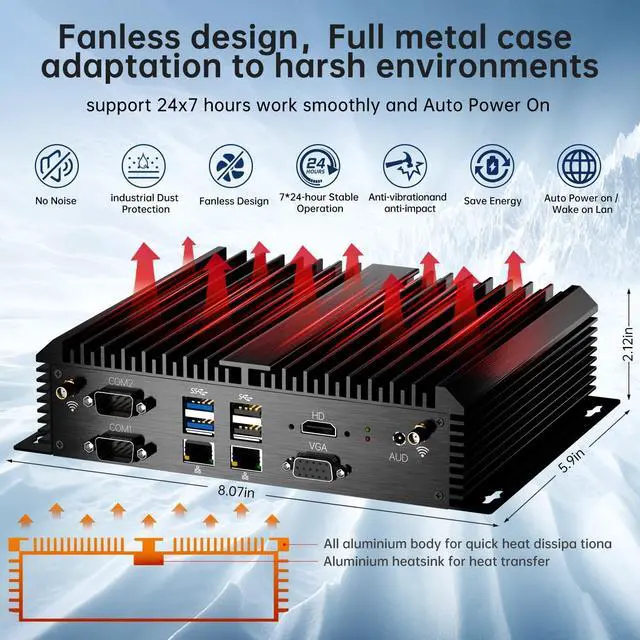 and It can give you an immersive, lifelike picture quality experience, more efficient, comfortable productivity. It can work in harsh environments. Full metal case help conduct heat. ^^ [Fanless Design & Ports] 4xUSB 3.2 (10Gbs/s), 4xUSB 2.0, 6xCOM RS232, 2x 2.5G RJ-45 LAN ports, 1xHDMI port, 1xVGA port. Mini PC with metal casing fully enclosed fanless passive cooling design, with low power consumption, dustproof, zero noise, anti-vibration, strong anti-interference, High compatibility ability, 24 hours of stable operation in harsh environments.