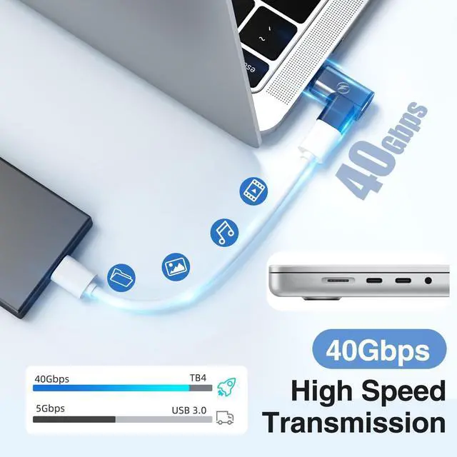 40Gbps Data Transfer & 8K@60Hz Video OutputOur 240w magnetic USB C adapter supports 40Gbps data transmission and 8K@60Hz video output, which helps you watch the video smoothly at home, in the school or office. 40Gbps transmission speed allows you to transfer music, documents, and pictures in a few seconds, increasing the efficiency of your work. (Note: You need a Thunderbolt 3/4 cable to achieve 40Gbps data transfer spe