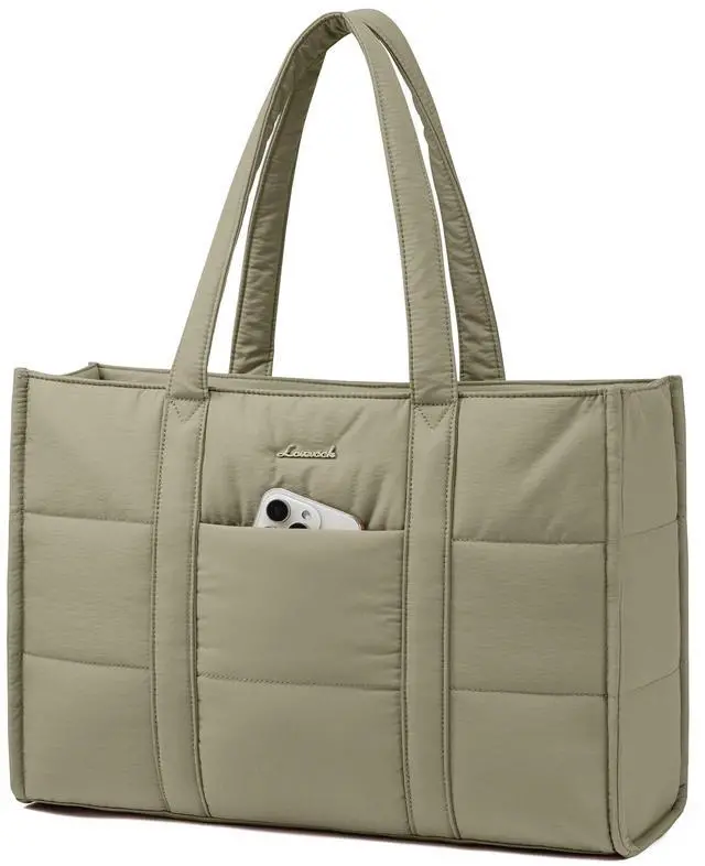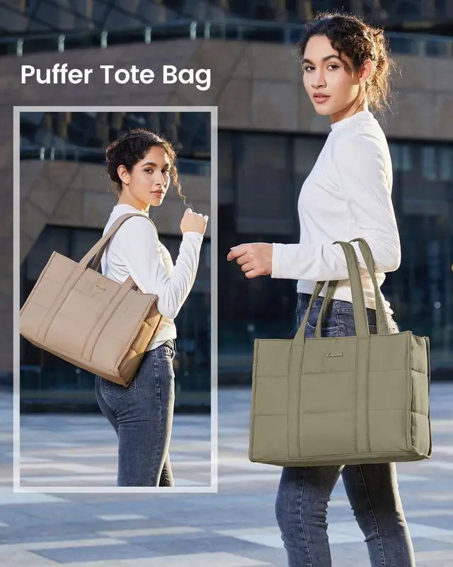 Keeping All Your Items OrganizedThis laptop bag for work has 1 separate padded 15.6 -inch laptop compartment, 1 iPad tablet pouch, 2 pen slots, 2 slip pockets, 2 side pockets, and 1 zipper pocket for your items ^^ Ideal for Casual WearThe tote bag for women features special edging and minimalist stitching details, making it ideal for everyday use, such as socializing, shopping, or other daily activities ^^ Lightening the Burden on Your Shoulders & HandsWeighing 0.99 LBS, the puffer tote bag is made from padded cotton for lightness, making it great for long time use ^^ Pick Items in a SecondThe front pocket of the quilted bag provides easy access to your phone.
