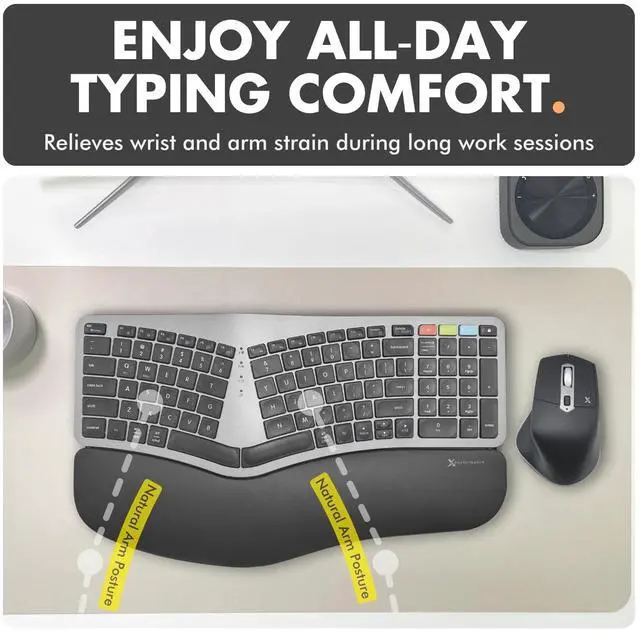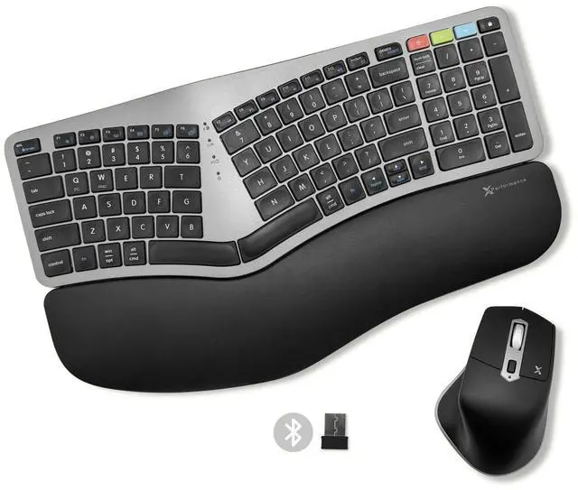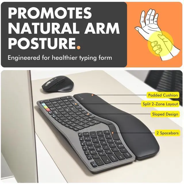 (ENHANCED COMFORT FEATURES) Experience the ultimate in ergonomic support with our Bluetooth keyboard and mouse combo, featuring an integrated wrist cushion, a split "2-zone" design for tailored hand placement, adjustable typing angles with four kickstands, and a mouse expertly sculpted to fit the contours of your hand. ^^ (CONNECT UP TO 3 DEVICES) With 2 channels for Bluetooth and 1 channel for 2.4G hz, our wireless keyboard mouse combo allows you to pair and switch between 3 devices at once. ^^ (RECHARGE AND GO) Both components in the ergonomic wireless keyboard and mouse set are equipped with rechargeable batteries that utilize a USB-C port.