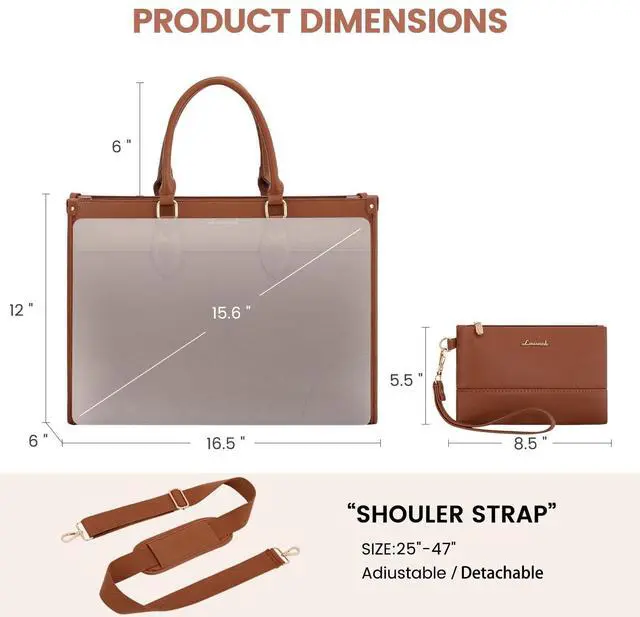 Women: This versatile tote bag comes with adjustable and detachable shoulder straps(47"-53"), allowing it to function as a handbag, shoulder bag, or crossbody bag, making it ideal for work. The rear concealed zippered pocket securely stores important documents. ^^ Free Clutch Bag & Reliable Warranty: A charming clutch bag ( 8.5" L x 5" H) is included for storing small personal items like mobile phone, glasses, and cosmetics. The briefcase for women is a perfect gift for mothers, daughters, and female friends. LOVEVOOK tote bag for women provides 12-hour customer service, 90-day hassle-free returns & 3-year warranty for your peace of mind.