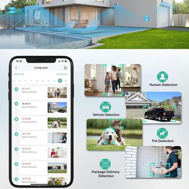 Color Night Vision: This outdoor security camera offers higher resolution and superior picture and video quality compared to 1080p. It features color night vision, capturing clear color video even in dimly lit environments, perfect for home security. ^^ Smart Motion & Audio for