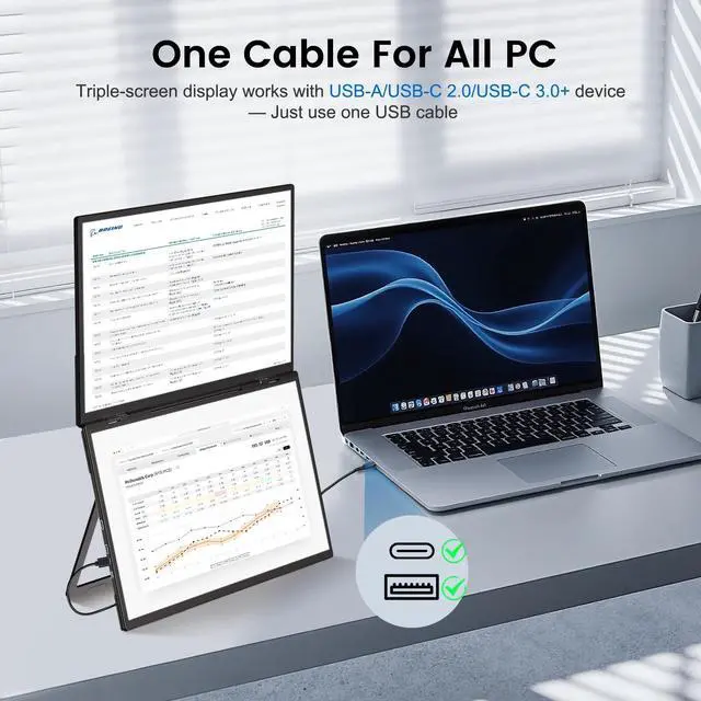 Any PC]: Connect to any laptop or desktop with just one USB cable for triple-screen expansion, fully compatible with both Windows and macOS. It supports various connection types, including USB-A, USB-C, and HDMI. ^^ [Premium