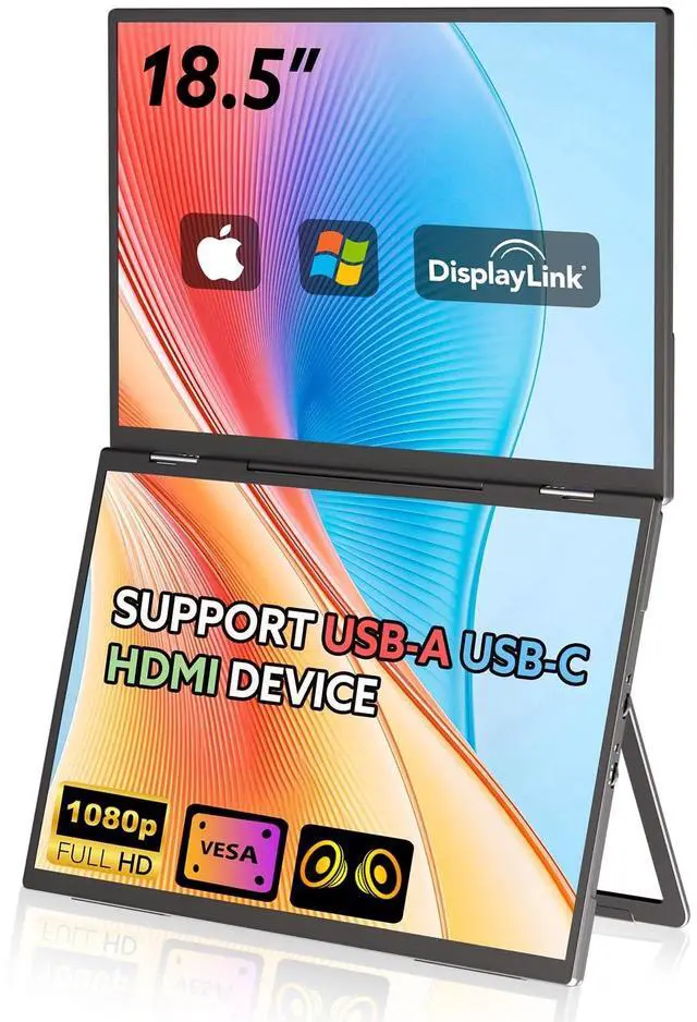 VESA Mountable]: Enjoy immersive sound with integrated speakers that enhance your viewing experience without the need for additional audio equipment, 90 adjustable stand and 180 foldable screen design allow for flexible viewing angles and easy storage, reducing thickness by 60% when folded, VESA mount compatible (75x75mm), providing flexibility in your setup for the ultimate convenience with the Dual Portable Monitor.