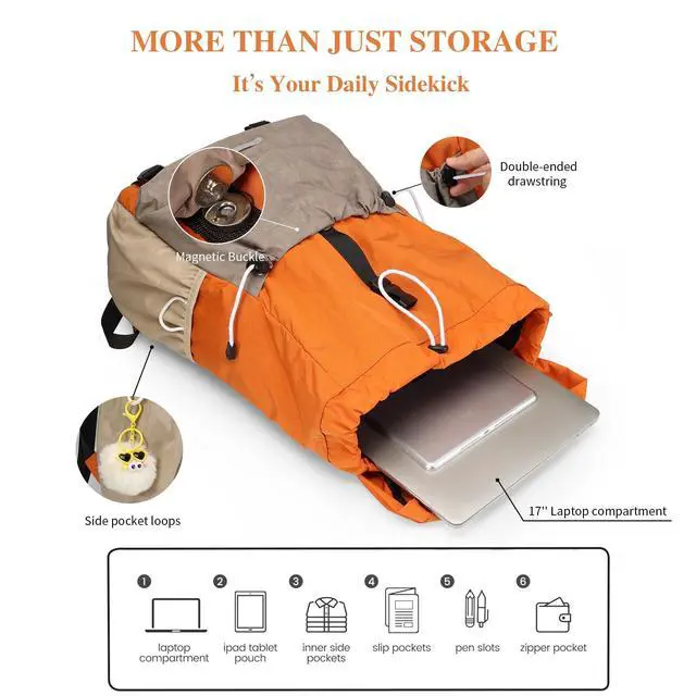 Ankyery School BackpackInspired by cinch bags, Ankyerys drawstring backpack lets you hit campus in style anytime. This stylish school backpack features a unique drawstring buckle design, blending bold aesthetics with functional creativity. Loved by students and trendsetters alike, its ideal for classes, coffee breaks, gym sessions, or just hanging out with friends ^^ Stylish Present ChoiceThis backpack for girls comes with a fluffy pom-pom keychain and trendy color options. The buckle drawstring design adds a playful touch, making it a stylish school backpack for girls and a thoughtful present for middle and teen girls ^^ Big Space, Smart StorageA padded compartment fits up to a 17-inch laptop and iPad, while the main compartment stores college supplies, clothes, travel essentials, and daily items.