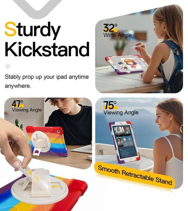 ^^ 360 Rotating Kickstand: BRAECN iPad case with stand offers multiple standing positions, ensuring sturdy and stable support in all directions. 360 flexible rotation for easy use when youre using this 5th/6th generation iPad case. It provides excellent backing and frees your hands when you need a steady viewing angle for work or study. ^^ Adjustable Shoulder and