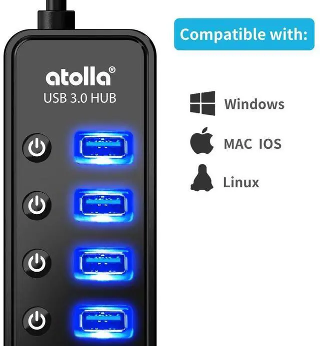 ^^ Maximum Compatibility and Performance- Compatible with Windows 10, 8.1, 8, 7, Vista, XP, Mac OS X (10. x or above), Linux and above. Fully plug and play, no drivers required and supports hot swapping ^^ In the Box- atolla 7-port USB 3.0 hub (100cm of the USB hub cord), 5V/4A Power Adapter (120cm of the electrical cord), Quick Setup Guide. Guaranteed by bauihr 18-Month Warranty