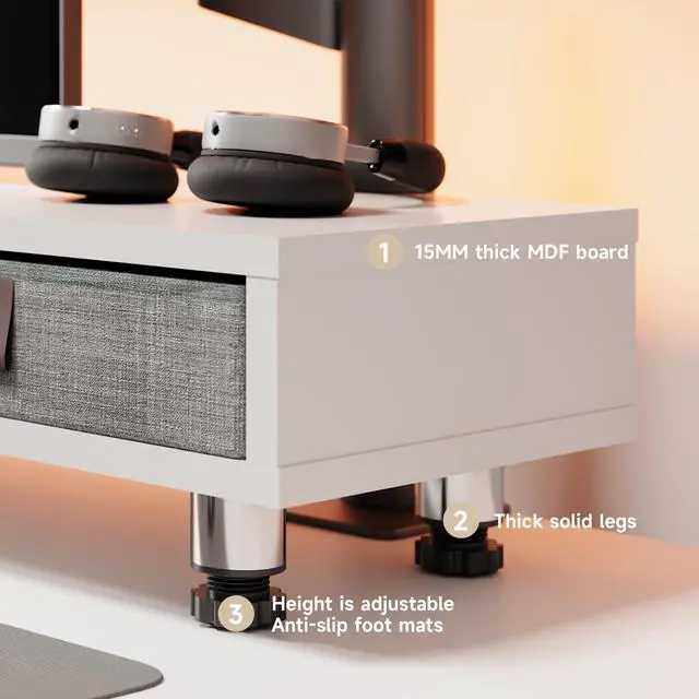 ^^ Sturdy and Stable: With a 5.9 inch/15MM thick MDF Board and thick solid leg design, monitor stand riser maximum load capacity is 99lbs, allowing you to work with peace of mind, without worrying about collapse or shaking during use, ensuring safety.