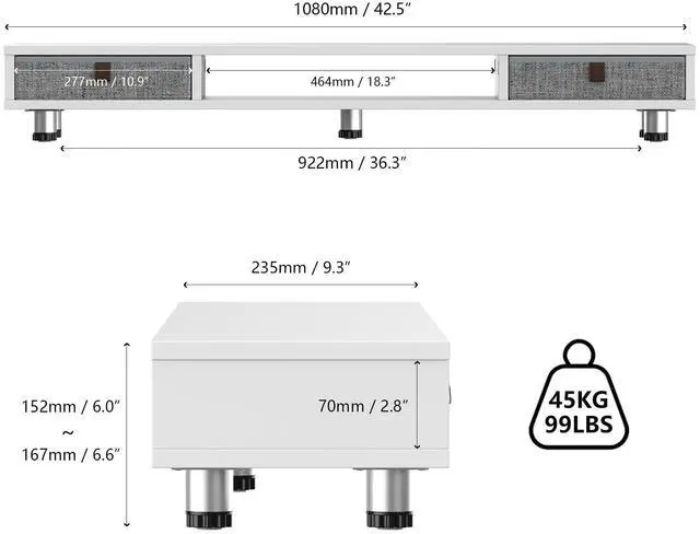 computer monitor riser dimensions: 42.5 x 9.3 x 6.0 ~ 6.6 inches, computer stand can hold two 32monitors, meeting your multi-screen office needs. It can also be used as a monitor stands, printer stand, laptop riser or TV stand.