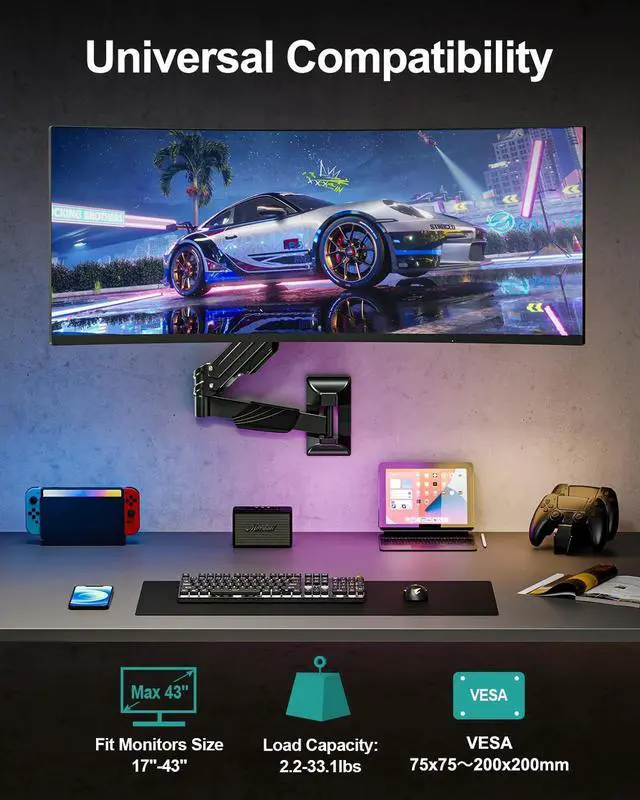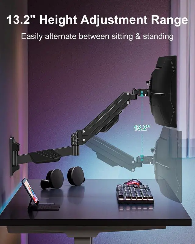 Built for Ultrawide Screens - The heavy-duty wall mount monitor arm fits most 17-43 flat or curved screens. It's engineered to securely hold large screens that weigh 2.2 to 33.1 lbs. VESA bracket has 75x75, 100x100, 100x200, 200x100 and 200x200mm mounting capability ^^ Full Motion Adjustments - Our wall mount bracket with a range of flexible motion featuring 360rotation for landscape or portrait mode, +90/-90tilt for the ideal screen angle, and +/-90swivel for effortless screen sharing. It offers 13.2 of smooth adjustable height range with pneumatic spring lift. You can easily find the ideal monitor position and angle, which will enhance comfort and efficiency ^^ Free up Your Desktop - Say goodbye to cluttered workspace with MOUNT PRO computer monitor wall mount.