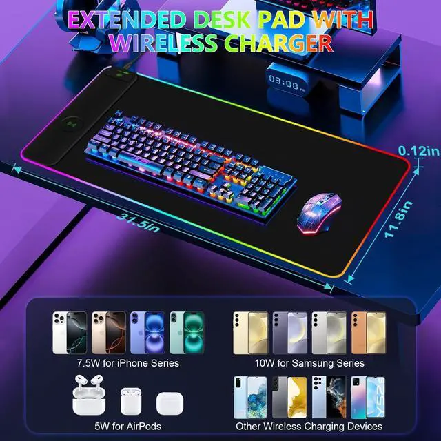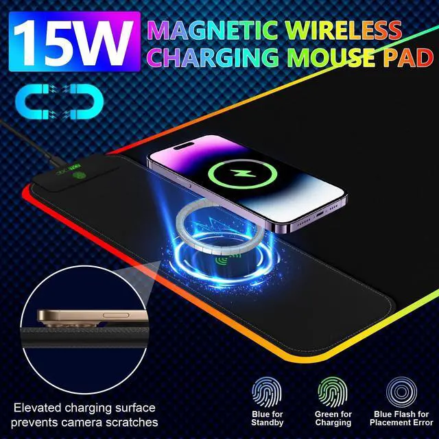 Auto-Snap Magnetic 15W Fast Charging 7.5W magnetic charge for iPhone 17/16/15/14/13/12/11/XR/XS/8 Series careless or with magnetic case, Max 15W for Galaxy/Pixel/LG, 5W for Airpods 2/3/4 (with ANC) /AirPods Pro 1/Pro 2/Pro 3, and other Qi-enabled Devices, just drop and charge, no more charging misalignment ^^ 24 RGB Lighting Modes with Memory FunctionCustomize your battlestation with 11 static colors, 11 dynamic breathing effects, rainbow wave, or fast rainbow mode. Our power-off memory feature saves your favorite light settingso its ready to go, right where you left off ^^ Smart Safety & Anti-Slip BaseGame with peace of mind! Built-in Smarship technology protects against overcharging, overheating, and short circuits.