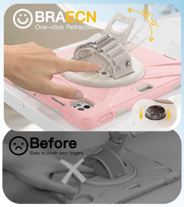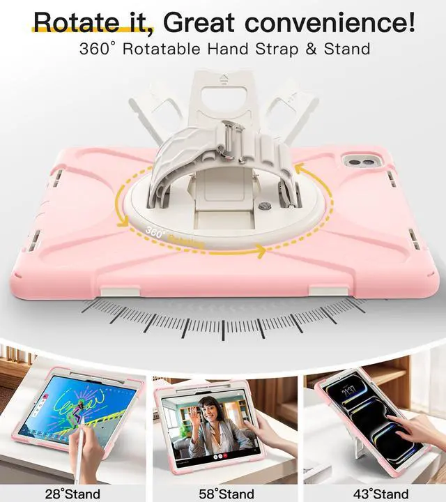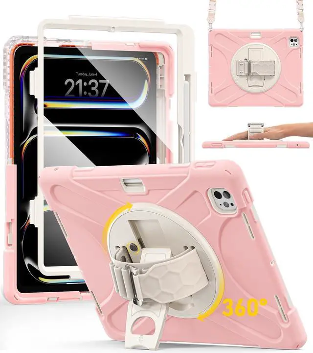 Protection &Kids Friendly]: This case for ipad pro 13 inch M5 2025 & M4 2024 features triple-layer construction and extra orange TPU cushioning strips, the outer silicone layer reinforces the dropproof performance of all four corners, plus there are 4x shockproof sponge pads on the bottom cover to prevent scratches to your tablet. Provides the ultimate in protection and durability, safe for kids to use. ^^ [360Rotating Anti-Slip Hand Strap & Stand with One-Touch Retract Button]With the rotating system as well as kickstand and Silicone handle, it makes this multi-functional case that you can use in any scenario, such as commuting, office, study, watching videos, typing. In addition, the adjustable shoulder strap can help you carry it easily, and you can also hang it on your car seat to use your tablet. ^^ [Screen Protector and