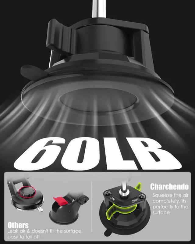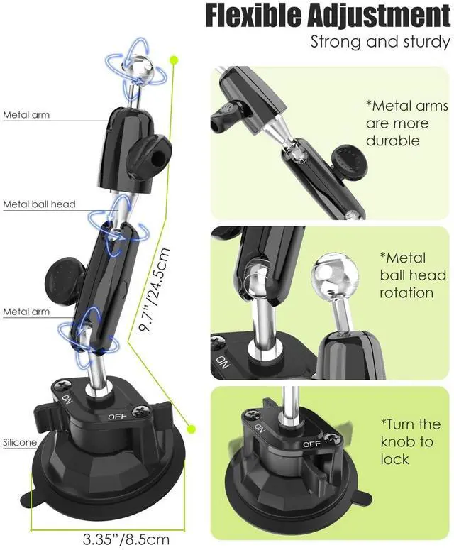 *Charchendo suction cup will not leave any residue or marks on the surface when removed! ^^ 3.35" Reusable Suction CupThe super-strong vacuum suction cup of this car tablet holder has a diameter of 3.35", which can keep the truck tablet holder firmly fixed to the windshield and dashboard even on very bumpy journeys. ^^ 7.5" Metal Arm & 360 Rotation Metal Ball HeadThe car dashboard iPad holder has a multi-jointed 360-degree rotating metal ball head and a rotatable metal arm, which is more durable and more stable than plastic materials. It provides a perfect driving viewing angle and will not block your sight, which is perfect for your safe travel.