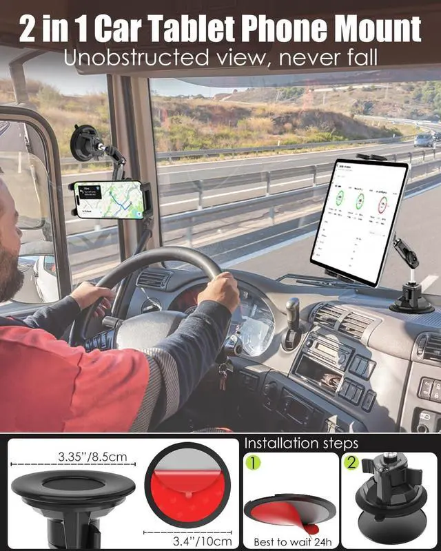 ^^ Multiple Mounting MethodsThe car iPad holder provides dashboard, windshield mounting for cars. The tablet holder has super strong adsorption ability on any smooth surface. Such as car windshields, windows, car hoods, glass tables, boat windshields, boat dashboards and tables. Ideal for heavy vehicles such as pickup trucks, vans, semi-trailers, buses and SUVs. ^^ Wide CompatibilityUniversal tablet mount adjustable clip fits all 4.7 -13'' devices. The clip size 4.7 - 9.64 '' ( 11.93 - 24.5 cm), Thickness 0.7 '' ( 1.8 cm), which makes the clip work with or without a case Can hold on tightly.
