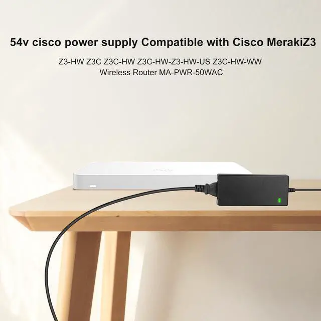 Suitable for use with Cisco Meraki MA-PWR-50WAC MAPWR50WAC power supply providing 54 volts and 0.92 amps, delivering a total power output of 50 watts. ^^ Power adapter with an output of 54V and 0.92A is suitable for use with the Cisco Meraki Z3 Z3-HW Z3HW 600-53010 Z3C Z3C-HW Z3CHW Z3C-HW-WW Z3CHWWW Cloud Managed Teleworker Gateway Wireless Router. ^^ 54v power supply is suitable for use in countries with voltages ranging from 100 to 240 volts and frequencies between 50 and 60 hertz. ^^ This cisco router power supply is equipped with protection features against overvoltage, overcurrent, overtemperature, and short circuits, ensuring a longer lifespan.