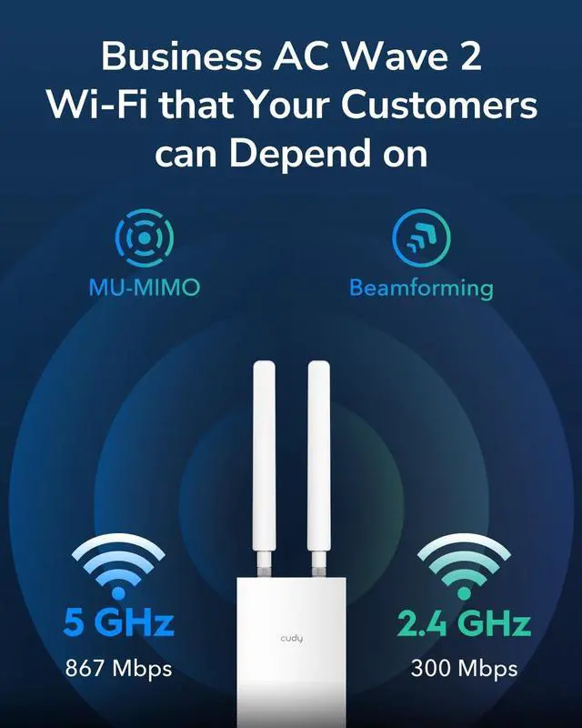 Outdoor AC1200 Gigabit Dual Band Access Point with MU-MIMO. Designed with the latest 802.11 ac Wave 2 technology, Cudy AP1300 can reliably delivers dual band Wi-Fi speeds up to 867 Mbps on 5 GHz and 300 Mbps on 2.4 GHz to multiple devices simultaneously. Designed with one gigabit ethernet port, AP1300-Outdoor can delivers up to 1000Mbps ethernet speed to wired devices. ^^ 5-IN-1 Multifunctional Wireless Access Point. AP1300 outdoor is not only an outdoor wireless access point, it can also work as an outdoor WiFi Extender, Gigabit Outdoor WiFi Router, Gigabit Outdoor WISP Router or Gigabit Mesh Router.