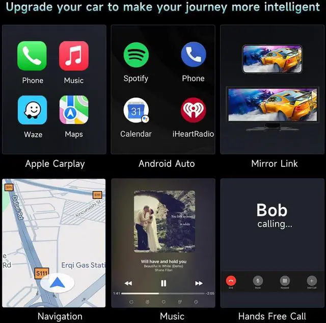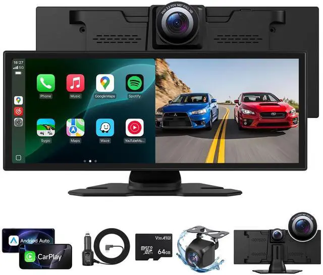The included 64G SD card can loop the video recording and make sure your portable carplay screen can save the video automatically. Reversing camera provided with 18 feet cable to make parking easier ^^ Multiple Audio OutputsThe android auto screen for car has Bluetooth, built-in speaker, AUX and FM transmitter audio output options. Connects to both the car play screen and the original car speakers via Bluetooth, making it convenient for you to control the music/call volume wirelessly while driving. The wireless carplay car stereo also supports playing audio from car speakers using AUX or FM transmission for a louder sound experience ^^ Simple Installationa-pple play for car just plug and play directly with dashboard via connect cigarette lighter.