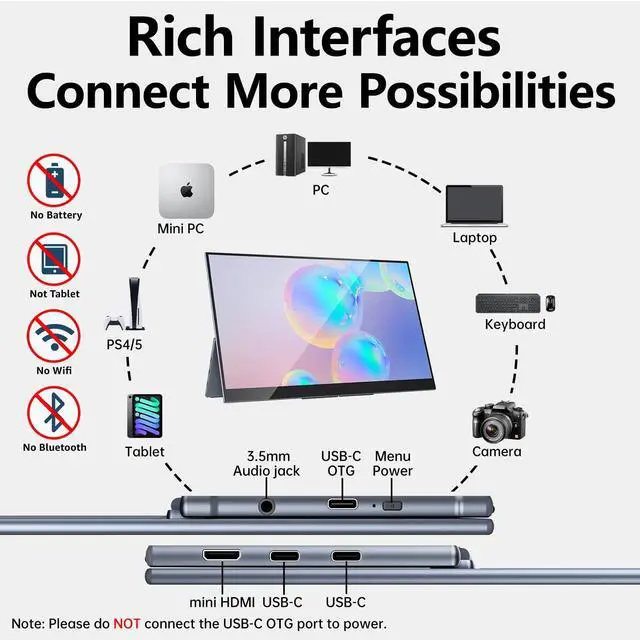 Play: This 4K portable monitor is equipped with two USB-C ports (for video&power) and one mini HDMI port. Its compatible with most of the laptops. Also this OLED monitor has a USB-C OTG port for you to connect with keyboard or mouse. We recommend to use the original 45W PD power adapter for sufficient power supply