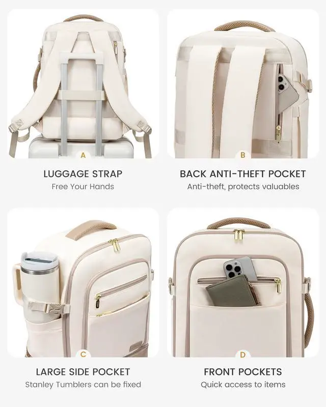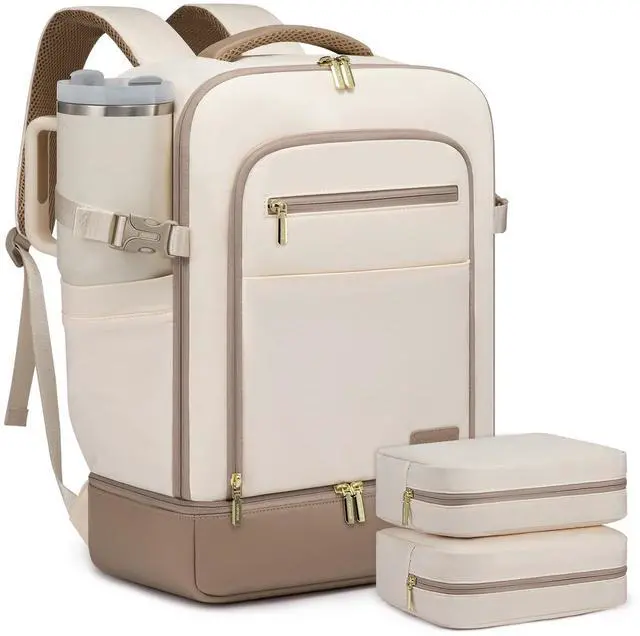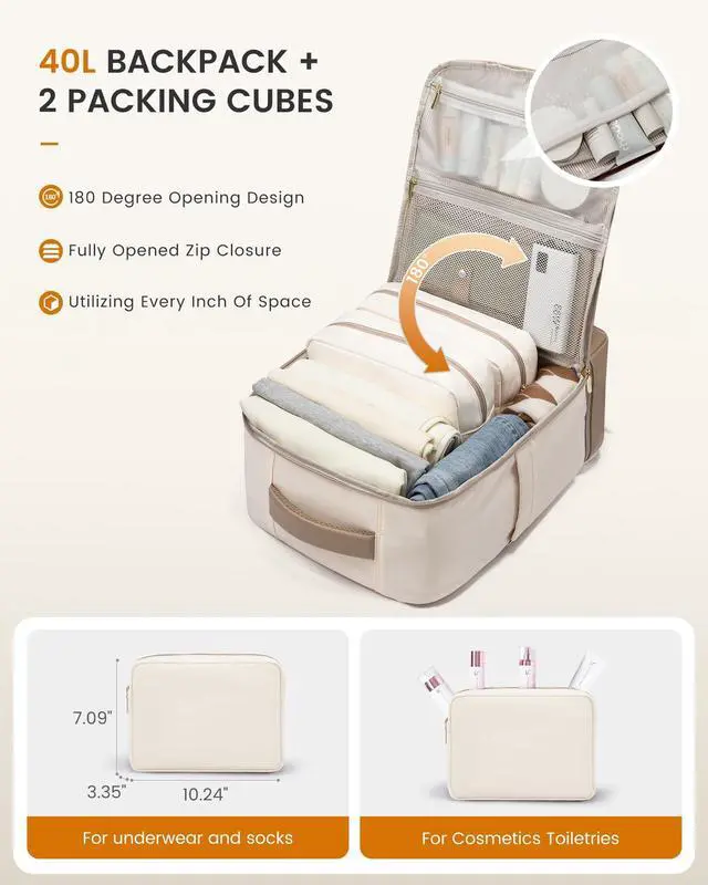 INDEPENDENT SHOE COMPARTMENT & 2 FREE PACKING CUBESThis carry on backpack for women comes with 2 packing cubes to store your underwear or toiletries. Separate flat bottom compartment of this travel bags for women can hold your shoes or dirty clothes for easy separation from clean clothes when traveling. Ideal for travel, business trips, or daily use. ^^ LARGE BACKPACK WITH MULTIPLE POCKETS This 40L travel backpack easily fits 3-5 days' worth of travel essentials. It features multiple compartments, including quick-access document pockets, a hidden theft-proof pocket, and a suitcase-style 180 opening main compartment that holds 5-10 sets of summer clothes, complete with two storage bags for organization.