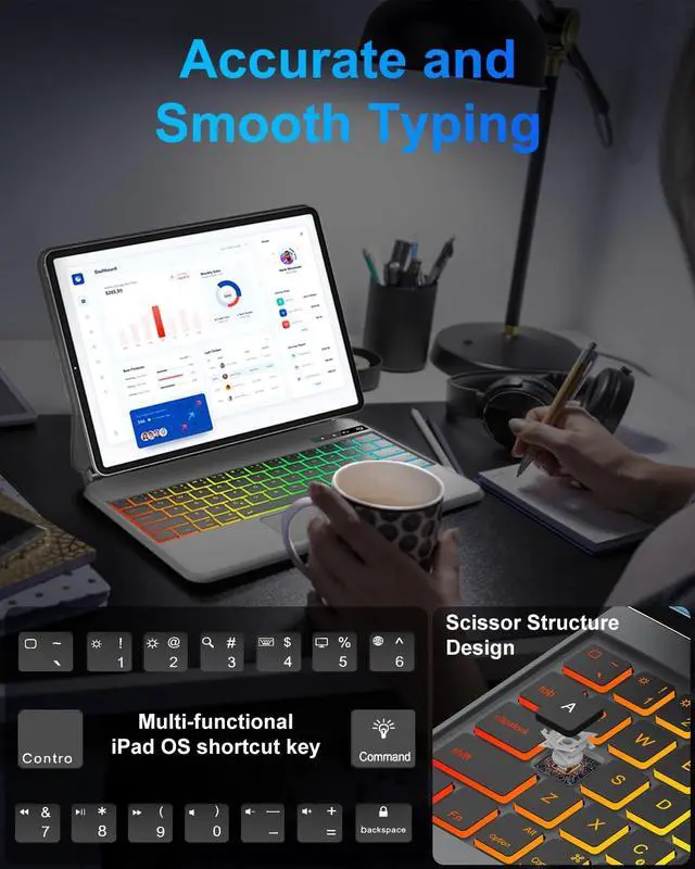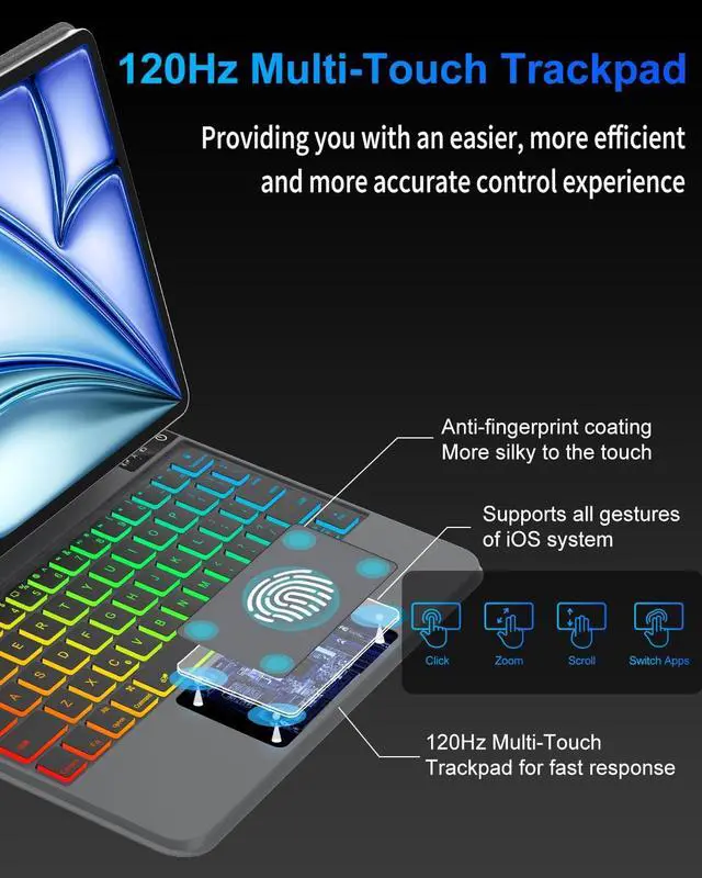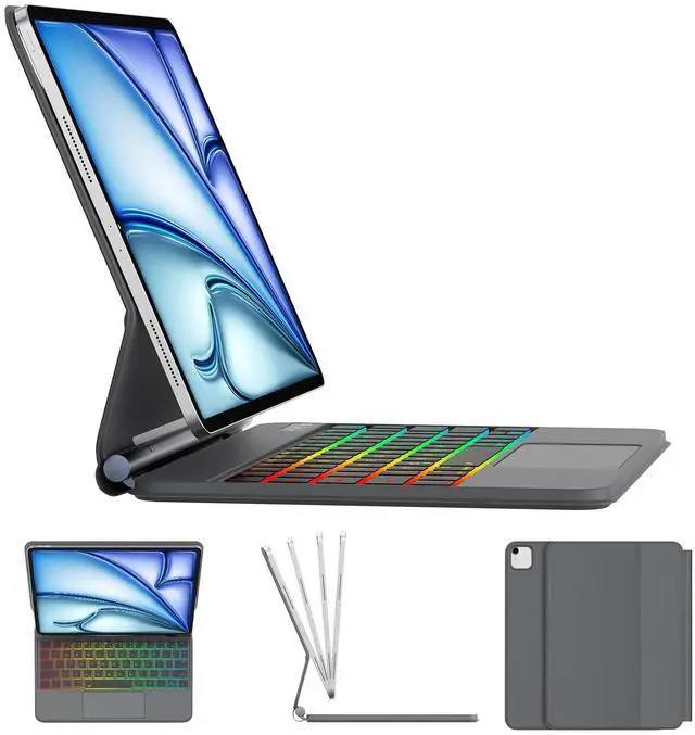 KVAGO Magic Keyboard Case for iPad Air 11 inch (M3, 2025/M2, 2024) & iPad Pro 11 inch 6th/5th/4th/3rd Generation - Magnetic Rainbow Backlit Keyboard Case with Multi-Touch Trackpad and Floating Cantilever StandOur confidence in our keyboard case comes from: It has a built-in full-size backlit keyboard, moderate key travel, comfortable feel, and excellent typing experience. Equipped with a multi-touch touchpad, supports various gesture operations, such as sliding, clicking, zooming, etc., and the operation is smooth and natural.