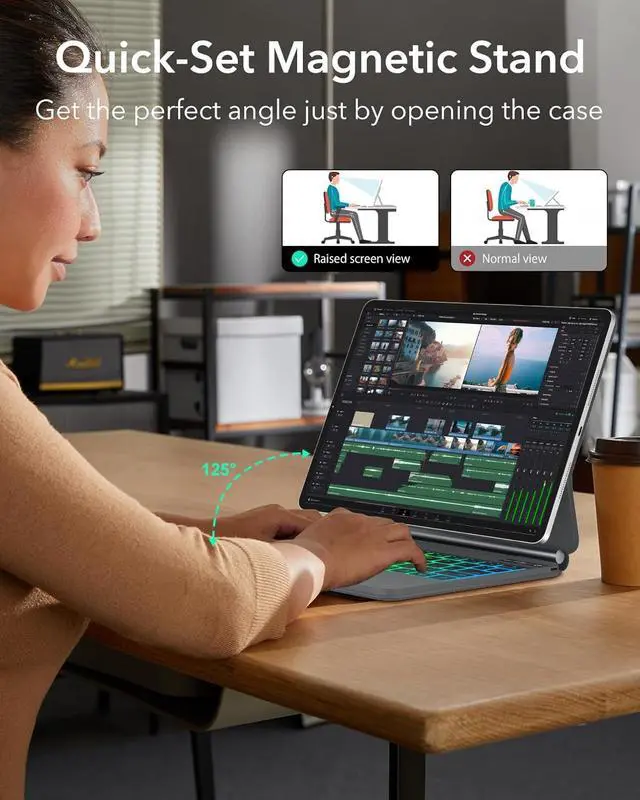 Suspension bracket: The bottom of the iPad Air M2 keyboard and the case are designed with an adjustable suspension bracket, which can adjust the iPad Pro to different angles, making it more comfortable for watching videos or typing.