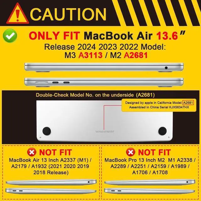 • ATTENTION -- Please kindly check the model number "Axxxx" on the back of the laptop before your purchase, make sure you choose the exact same model number as the listing title stated "A3240 or A3113 or A2681". The case is not compatible with any other models the above unmentioned