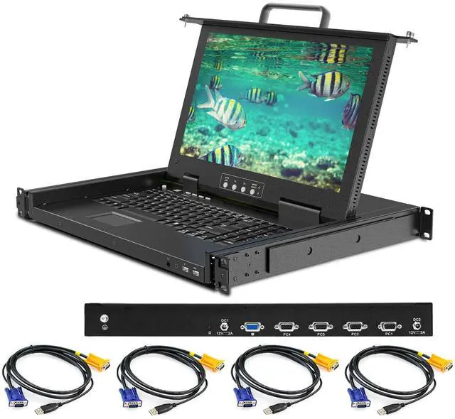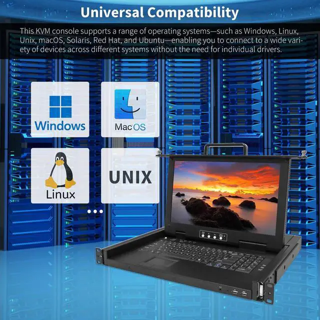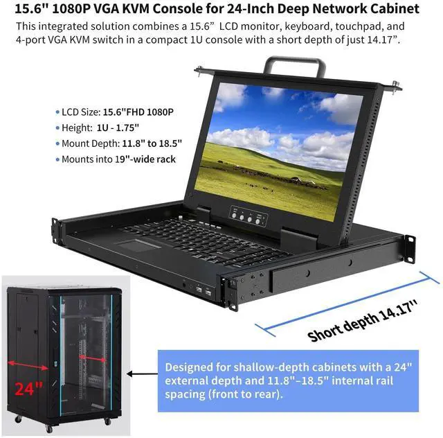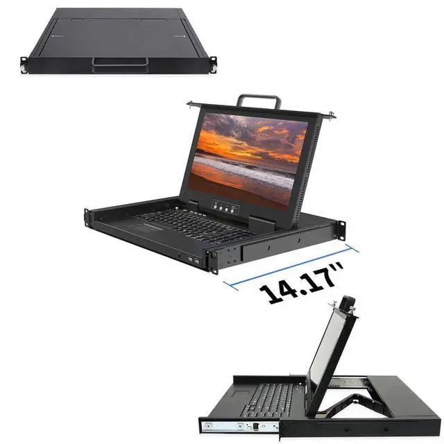 Always-On Connection: All connected computers remain active and ready, allowing you to switch between them at any time without losing connection. ^^ Experience exceptional visual clarity on the integrated 15.6" FHD TFT LCD display. The monitor delivers sharp 1920x1080 resolution with high brightness and contrast, ensuring crisp visuals for detailed monitoring. The integrated ultra-slim keyboard includes a numeric pad for efficient data entry, while the high-resolution touchpad with a scroll wheel provides precise cursor control, all within a compact 1U rack mount KVM drawer. ^^ Engineered for maximum reliability, this rackmount KVM switch console features a dual power supply redundancy design and includes two front-accessible USB ports. These convenient front USB ports allow for easy connection of additional peripheral devices, such as an external keyboard or mouse, enhancing operational flexibility during maintenance tasks or diagnostics without disrupting the main console setup. ^^ Built to withstand rigorous data center demands, this LCD KVM console features a heavy-duty steel construction with a protective surface coating and sturdy metal sliding rails. This robust build ensures smooth, reliable extension and retraction through years of frequent use, making the unit exceptionally durable and perfectly suited for the challenging environment of server rooms and network closets.