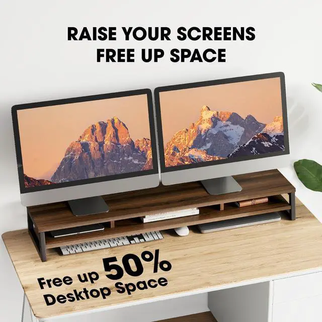 ^^ Large Monitor Stand: The dimensions of the desktop riser is 42.5"L X 9.2 "W X 5.4"H. Computer monitor stands for 2 monitors/laptop/TV. This is an ideal choice when you need multiple computers to work together. Large and sturdy, with added central support beam, it has enhanced stability. It can accommodate 99 lbs (45 kg). ^^ Raise the