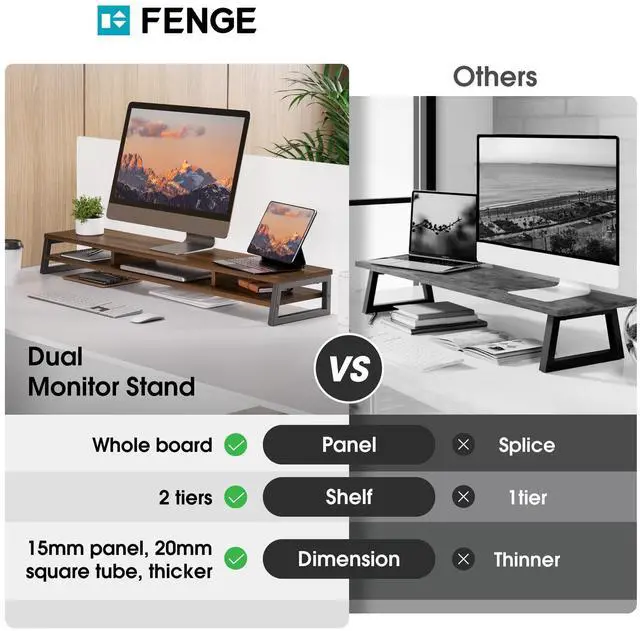 ^^ Easy to Install: Fenge monitor stand for desk are both whole boards, no splicing installation, complete with pre-drilled holes, The package has instruction and tool inside. 15 Mins quick and easy to assemble.