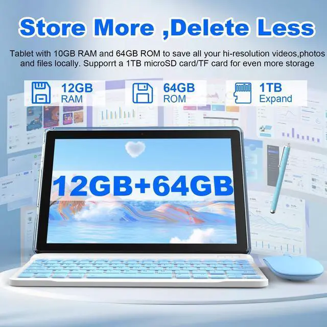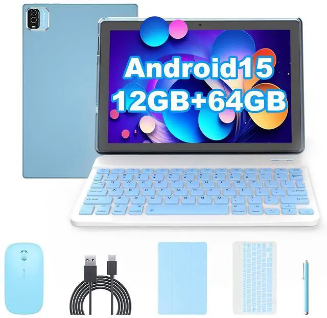 Newest Android 15 Tablet Tablet is equipped with the latest Android 15 system, which has been upgraded in all aspects of system operation, with faster response time and more focus on user privacy and security. It also adds a lot of interesting and convenient operations, which greatly improves the user's operating experience ^^ 12GB + 64GB + 1TB ExpandableThe Android 15 Tablet PC features memory expansion technology with 12GB RAM (4GB fixed memory, 8GB virtual memory) to make multitasking smooth; 64GB ROM to make the storage space super large. It also supports 1TB microSD card expansion (card not included) to download games, music or videos as you wish ^^ Notebook and 2 in 1 Tablet with KeyboardThe 10 inch Android 15 tablet package includes a 10.1 inch tablets, a wireless keyboard and mouse, a protective case, and a flexible stylus.