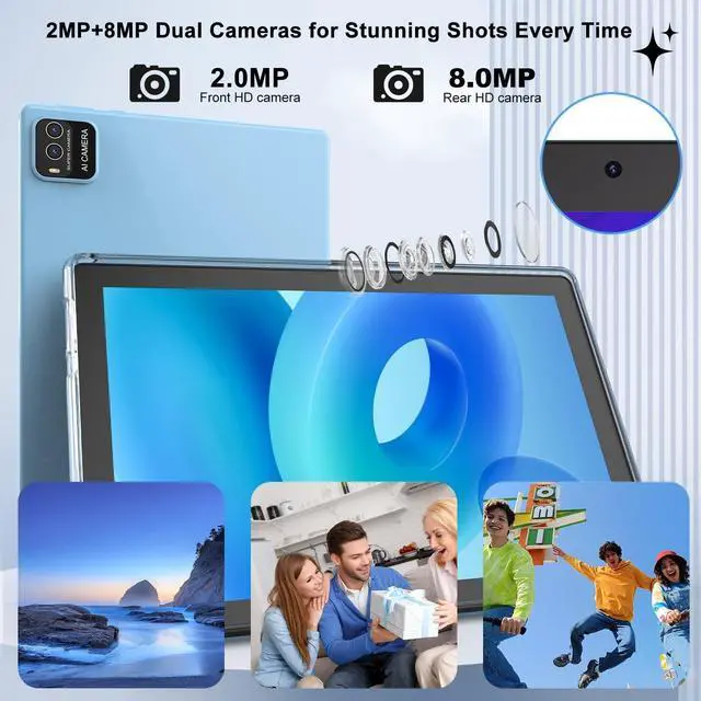 You can switch from tablet to laptop mode at any time. 2 in 1 Tablet PC can fulfill all your needs at work and in everyday life ^^ 10.1 Inch HD IPS Screen and HD CameraThis Android 15 tablets features a 10.1 inch P+G FHD IPS high-definition screen with 1280x800 resolution for sharp, vibrant and lifelike images. Whether you're streaming your favorite movie or playing a video game, you'll be completely immersed in the visuals. The 10 inch tablet comes with an 8MP rear camera to clearly capture life's The 2MP front-facing camera provides excellent clarity during video calls ^^ 2.4G /5G Wifi 6 + BT 5.0 + 6000mAh10 inch Tablet supports high speed dual-band, can connect to any 2.4G + 5G WiFi 6 network, Bluetooth 5.0 function, wireless signal is more stable, transmission speed is faster, make the wireless device more power saving.