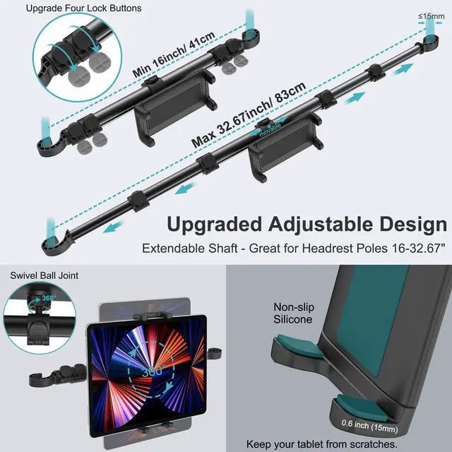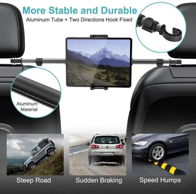 More Stable Headrest MountDosvsi car tablet headrest mount is made of aluminum and has two direction hooks firmly fixed on the headrest rod(max diameter: 0.59" /15mm) to effectively prevent vibration. Keep your tablet absolutely stable and secure, even on rough roads. The tablet clip has rubber pads to keep your devices from scraping or sliding. ^^ Upgraded Adjustable Arm DesignFour newly designed locking buttons allow you easily adjust the length of the black telescopic pole,