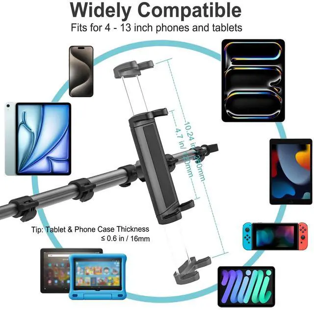 Adjustable Range: 16 - 32.67 inches. This extra long aluminum arm car headrest holder is widely suitable for different car models, especially medium and large cars, such as Pickup, Semi-truck, Sedan, Van, SUV, Station Wagon, etc. ^^ Wide CompatibilityCar Headrest Tablet Clip compatible with 4-13" devices, such as iPad Pro 12.9 13, 2024/ 2021/ 2020 iPad Pro 11, iPad Pro 10.5 9.7, iPad 10th 9th Gen 10.2, iPad Air 6th 5th 4 3 2 1, iPad Mini 7 6 5 4 3 2 1, Galaxy Tab S9 S8 S7 S6/A9 A8 A7 A6, kids tablet, android tablets, iPhone 17 16 15 14 13 12 11 Pro Max, iPhone 16 15 14 Plus, iPhone 13 12 Mini, iPhone Max Xs XR X 8s, Galaxy S25 S24 S23 S22 S21, Z Fold, Z Flip, Surface Pixel. ^^ Great for Car JourneysThis rear seat tablet mount with swivel ball head can rotate 360 degree and move left-right on the telescoping tube (Retractable range: 16 - 32.67 inches), supports more viewing angle and brings great fun for kids & rear passengers when watching movies, reading or playing games during long road journey. ^^ Easy InstallationThe back seat tablet mount is easy to install on the car headrest rods without tools. All Dosvsi products provide 60 days refund and 12 months manufacturer quality after-sales service. If you have any questions during using, please feel free to contact us. >Not suitable for car headrests without metal headrest bars.