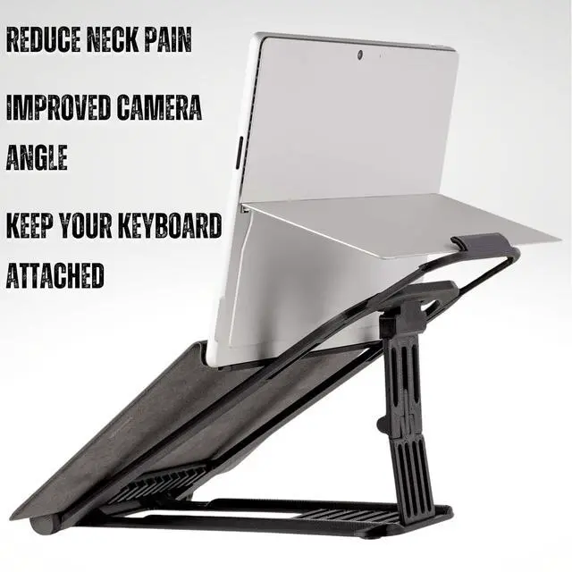 Ideal for REDUCING NECK PAIN caused by looking down at the Surface Screen. Also great for MAKING YOU LOOK BETTER IN ZOOM/TEAMS MEETINGS by improving your camera angle. Surface Pros are great for life on the go but too often we found ourselves cramped over at the kitchen bench or Cafe table and wondering why our neck was sore. And don't get us started on the 'double chin effect' of looking down at the Surface camera! When we went to find a stand, we couldnt find anything that supported the Surface backstand and allowed the keyboard to stay attached.