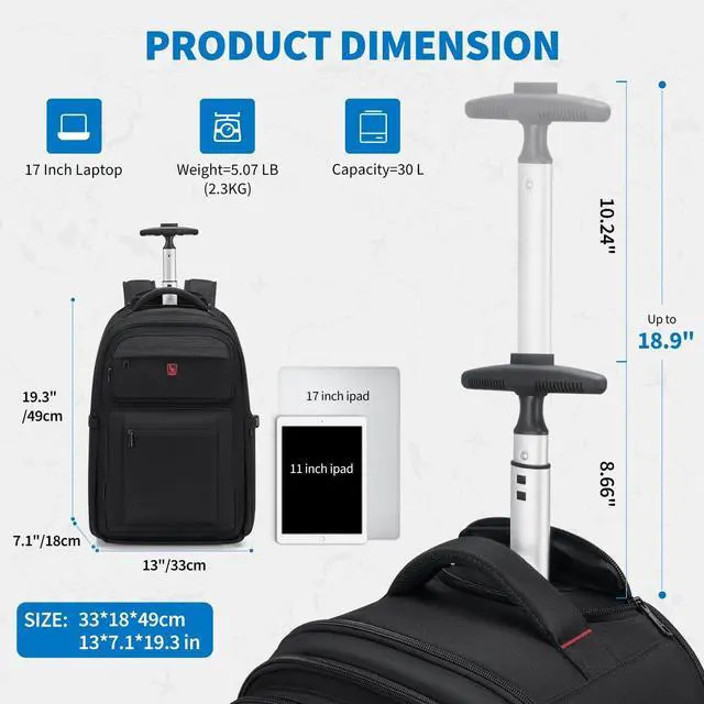 This backpack with wheels is convenient for security checks, it is designed to meet most airline carry-on baggage requirements and fits easily into the overhead rack ^^ Comfortable Ergonomic Design - This professional backpack with wheels is engineered for comfort and capacity. The ergonomic design is capable of reducing back strain during travel, and its spacious interior is fully capable of organizing all your business and tech essentials on the go ^^ Multiple Uses - This backpack with wheels is designed for seamless transitions across your daily life. Its used for business trips and airport travel, keeping your laptop and essentials organized on the go.
