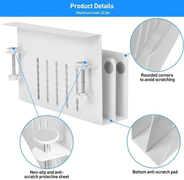 • High Quality MaterialThis metal side hanging desk organizer is crafted from high quality iron. This sturdy under-desk laptop holder supports up to 22lbs and can be paired with magnetic cable holders, USB hubs, and other devices.