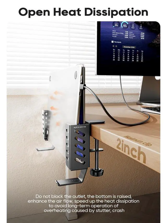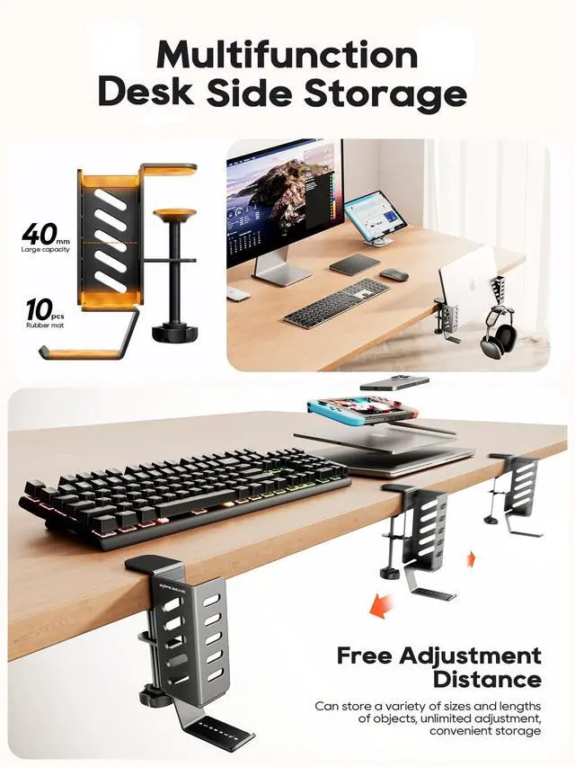 Save storage space: This stand is very small and can be disassembled and stored when not in use. ^^ Load Capacity 22lbWe sourced the highest quality steel, making it very strong and durable. The load capacity is 10kg ( 22lb), which compatible with laptops of any model. ^^ Doesnt damage your deskThis hanging desk organizer is installed by clip-on, no holes need to be drilled on the desk. The installation is very flexible, and the installation position can be changed at any time. The part in contact with the desk is equipped with a non-slip pad, so there is no need to worry about the holder falling off. ^^ Headphones/Bags can be Hung under the DeskThere are the hooks at the bottom of the desk clamp. It can be used to hang bags, headphones and other items. ^^ 2-Year WarrantyFree return within 30 days, free warranty within 2 years. If there is any problem with the product, please feel free to contact us through the order page.