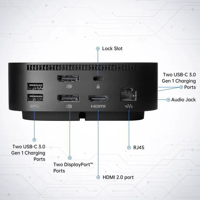 [Multi-functional Connectivity] The HP G5 docking station has multiple seamless connection ports. Including 1 x Powered USB 3.0 1 x USB-C (Power Port) USB-C 1 x Audio 1 x Super speed USB 3.0 1 x Network 2 x Display/ Video - DisplayPort 1 x Display/ Video HDMI. The diversity of ports ensures compatibility with various devices.