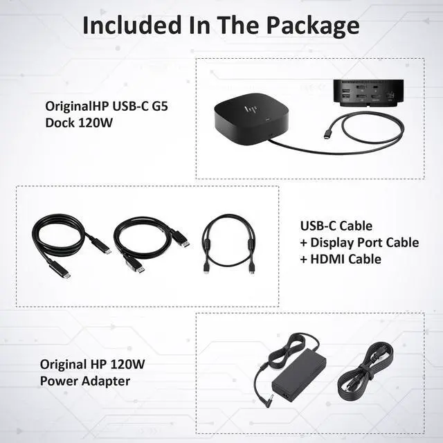 HP Docking Station for Dual Monitor Bundle - 1 Year Warranty, HP USB-C G5 Dock for USB-C & Thunderbolt Laptop with 120W AC Adapter + HDMI & DisplayPort Cables + USB Cable