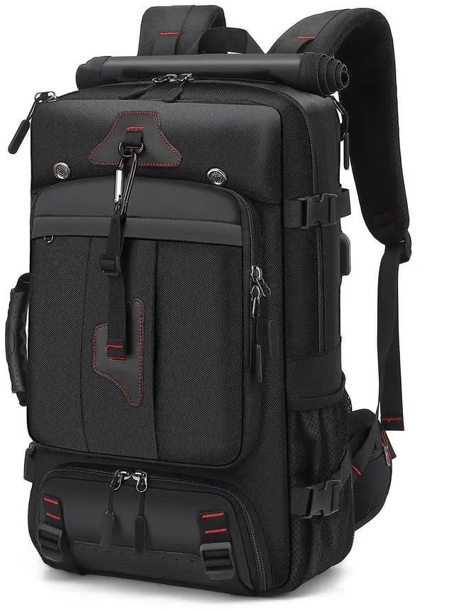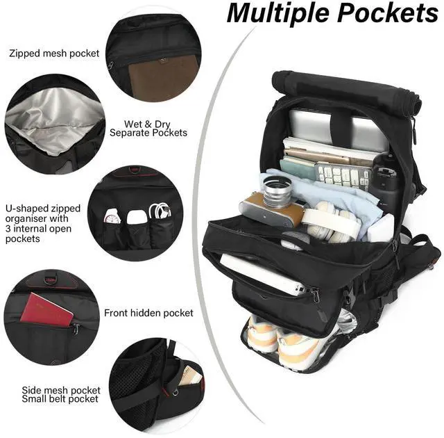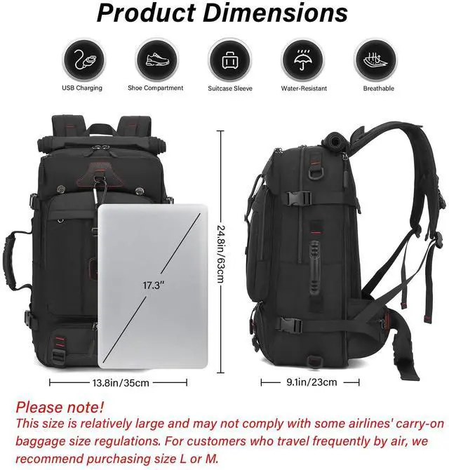 Size: 24.8 X 13.78 X 9.06 in (63 X 35 X 23 cm), weight: 3.86 lbs. A 29 to 52 inch removable and adjustable shoulder strap; Can hold your 18 inch laptop. Please note! This size is relatively large and may not comply with some airlines' carry-on baggage size regulations. For customers who travel frequently by air, we recommend purchasing size L or M ^^ Multi-compartment and Multi-pocket - 1 shoe compartment, 1 U-shaped zipped organiser with 3 internal open pockets, 1 top wet/dry pocket, 1 front hidden pocket, 1 side mesh pocket, 2 small belt pockets, main compartment with 1 17in laptop compartment, 2 internal patch pockets, 1 zipped mesh pocket, 1 zipper pocket on the back that hides the backpack strap ^^ Versatility - This backpack features a USB port, wet pocket, separate shoe compartment, adjustable and removable shoulder straps and can be used as a duffel bag. Versatility pocketto keep your items organised and easy to find ^^ Sturdy and Durability - This travel backpack made from high quality nylon fabric that is waterproof, abrasion and scratch-resistant. Polyester lining with soft decompression foam ^^ Suitable for Various Scenes - This multifunctional backpack can be used as a travel bag, hiking backpack, mountaineering bag, gym bag, cycling bag, overnight camping bag