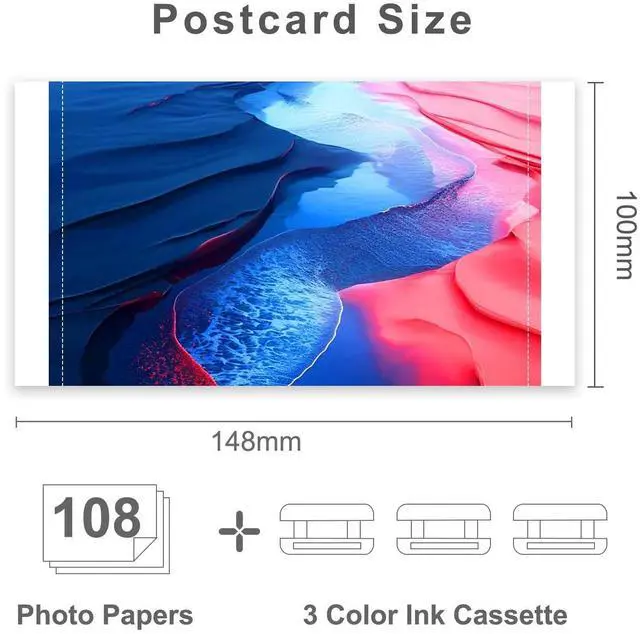 Package Contents: 3 Color Ink Cartridges & 108 Sheets 4x6 Photo Paper Glossy (4 x 6", 100 x148mm) ^^ Installation Tips1. Tighten the ribbon rotating roller before use to make it flat, which can avoid the machine displaying the error message of Cartridge Empty and avoid paper jam when printing. 2. Install the ribbon after turning on the printer, and then remove it after printing, which can effectively avoid ribbon waste. ^^