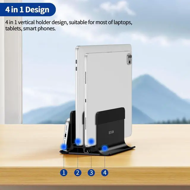 Design: 4 in 1 vertical holder design, suitable for most of laptops, tablets, smart phones, e-book, portable keyboard. You could hold 4 different devices simultaneously, keep your desktop clean and neat.