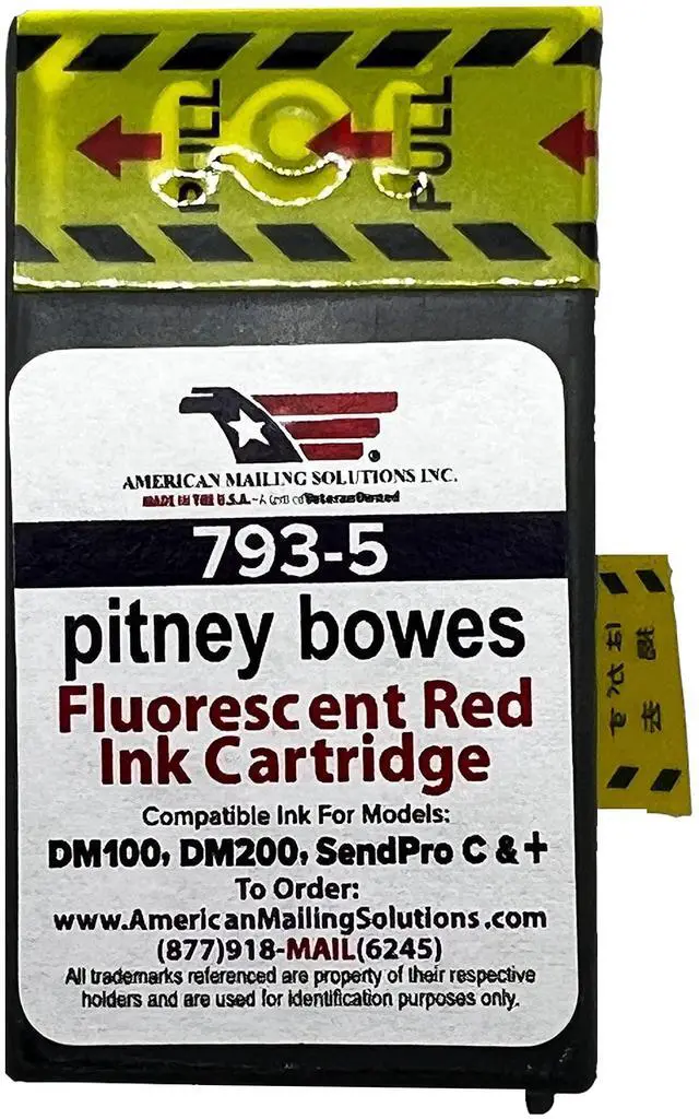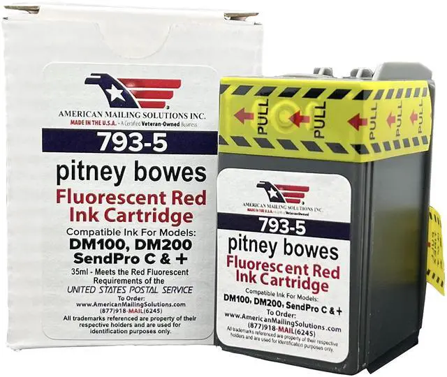 ^^ The 793-5 is a USPS-certified red postage ink cartridge compatible with the DM Series and SendPro Series. There is one (1) per box, 2 sets. Our ink is plug-and-play without any frustrating key prompts. ^^ Our 793-5 ink cartridge is readable if wet with no issues. The ink is widely used with envelopes, postcards, and self-mailers, either uncoated or gloss paper stock.