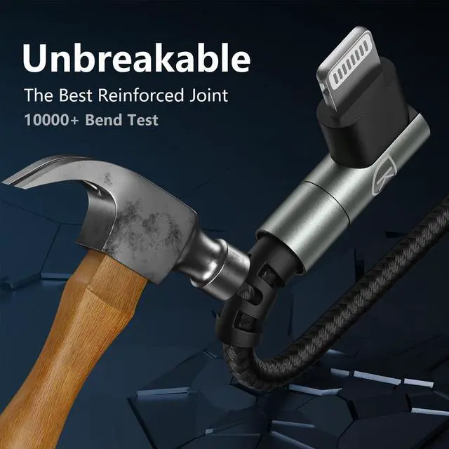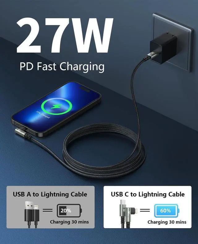 Charger Cable: The 90 degree USB C to lightning cable 10ft comes with L shapes connections (Lightning end), which can fit the device sideways. 90 degree extra long 10 FT iPhone charger cord is more convenient for playing games, watching video when you while charging. ^^