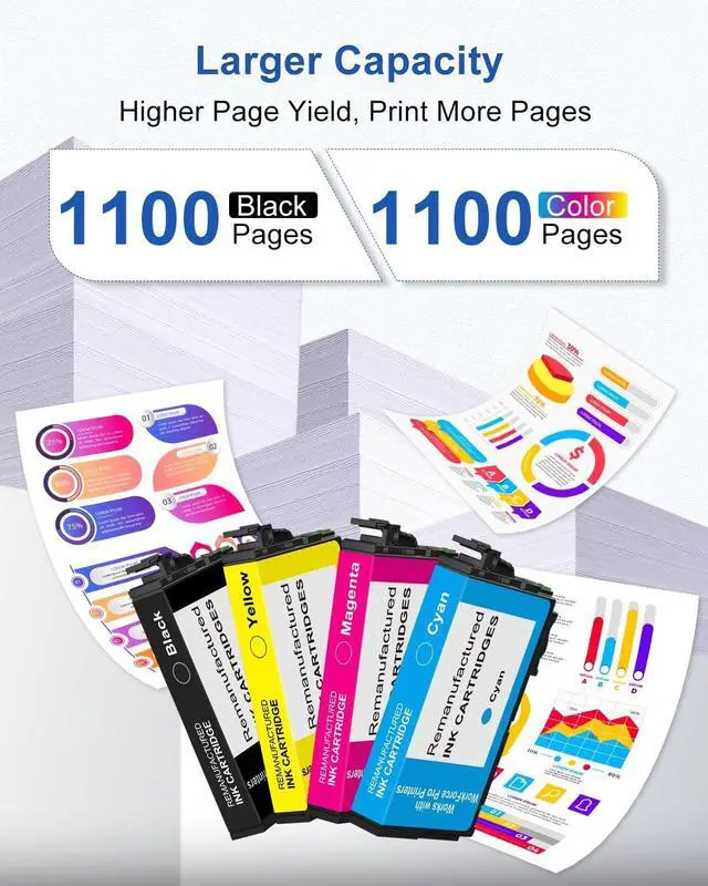 Printing Capacity: 1100 pages with each black ink; 1100 pages with each color ink (depends on printer and usage) ^^ Engineered with smart chips for seamless integration with your replacement for epson 822xl ink cartridges combo pack for workforce printer. This enables fast recognition, real-time ink level tracking and reliable, high-quality printing to fulfill all your tasks ^^ Unlock brilliant, high-quality prints with our premium replacement for epson ink 822xl. Engineered for easy installation and strong compatibility, they consistently produce vibrant colors and razor-sharp text, giving your documents and photos a professional finish ^^