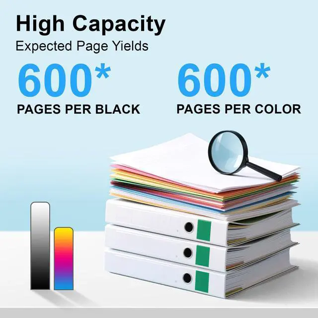 High-Yield: 600 pages for Black, 600 pages for Cyan, 600 pages for Magenta, and 600 pages for Yellow (Letter/A4, at 5% coverage). More than double the yield of standard cartridges, with crisp text, fade-resistant colors, and smudge-free prints ^^