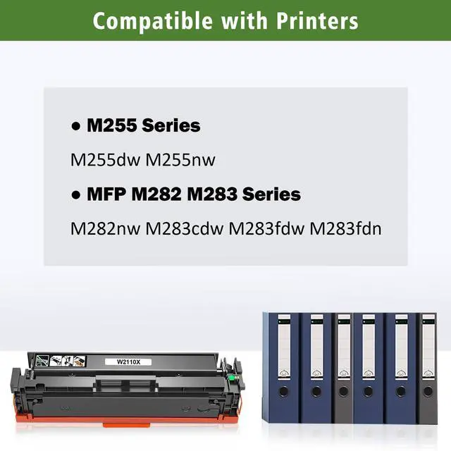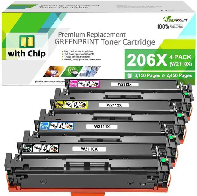 Important Note Please must close the Genuine Mode before you install compatible toner cartridge with chip, the step is Setup >Supply Settings >Cartridge Supply>off. In order to avoid firmware update to block the compatible toner cartridge to be used continuously in the future, please also close the Printer Update and Firmware Update in Setup. ^^ Item includedGREENPRINT Compatible Toner Cartridges 206X ( 206A ) WITH CHIP 4 Colors Set. These cartridges can be used for replacing original 206X 206A W2110X W2110A W2111X W2111A W2112X W2112A W2113X W2113A toner cartridges. ^^ Compatible with printers Compatible for Pro M255 Series M255dw M255nw; MFP M282 Series MFP M282nw; MFP M283 Series MFP M283cdw M283fdw M283fdn Printers.