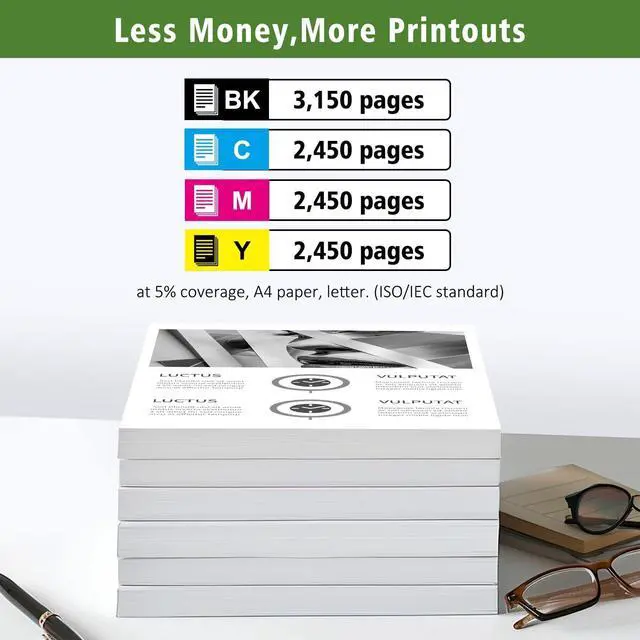 ^^ Page yield High capacity, 3150 pages for Black, 2450 pages for Cyan/Yellow/Magenta at 5% coverage, A4 paper, letter. (ISO/IEC standard). ^^ Superior Print QualityTrust in our compatible toner cartridges to consistently provide reliable performance. With advanced printing technology and high-quality components, our cartridges offer consistent and dependable results throughout their lifespans.