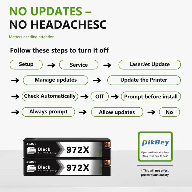 No Hassle: Automatic printer updates may interrupt your printing with compatible cartridges when you need them most; we recommend that you turn off the automatic update feature to avoid unpleasant surprises ^^