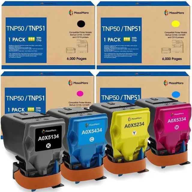 Model: TNP50 TNP51 (Black A0X5134, Cyan A0X5434, Yellow A0X5234, Magenta A0X5334) Toner Cartridges. Formulated with premium A-Grade toner, these cartridges deliver sharp, professional prints with vibrant color accuracy while ensuring reliable performance that protect your printer and extends its lifespan.